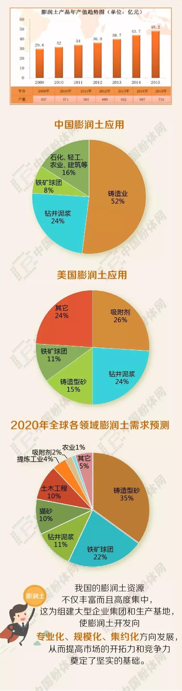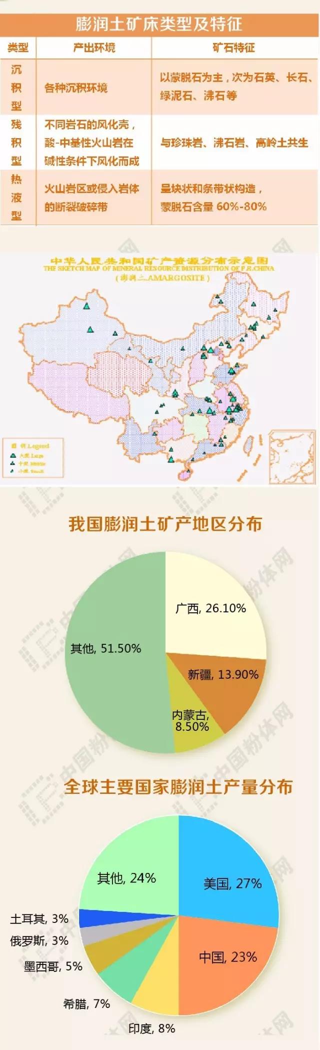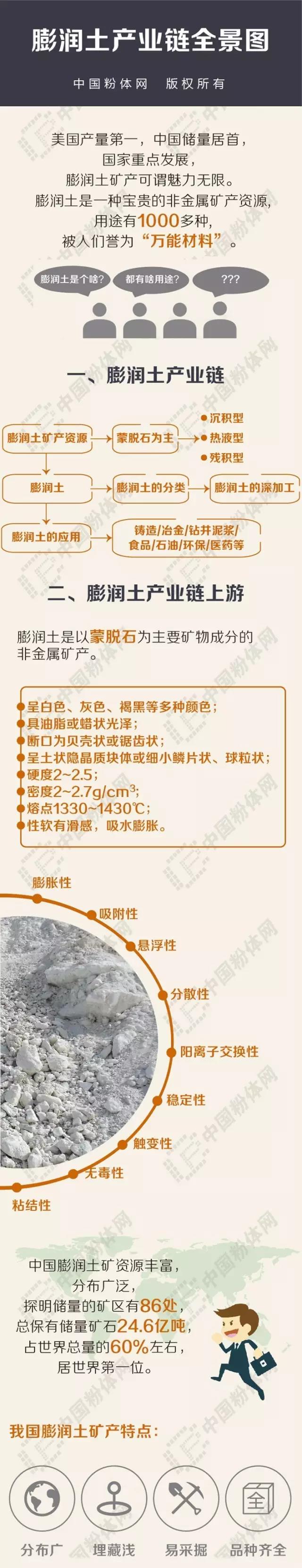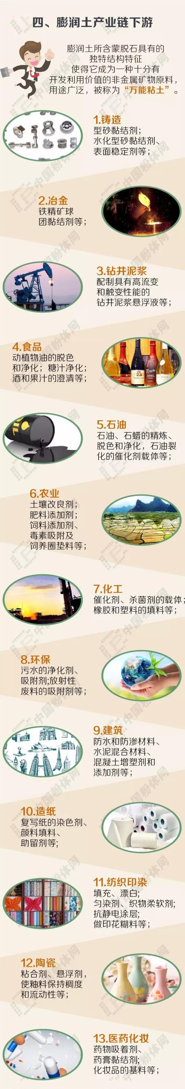 膨潤土是一種開發(fā)應(yīng)用較廣泛、具有較高經(jīng)濟價值的非金屬礦資源。由于兼具吸附性、離子交換性、遇水膨脹等性能,膨潤土在工農(nóng)業(yè)生產(chǎn)24個領(lǐng)域的100多個部門中均有應(yīng)用,素有“萬能黏土”之稱,與膨潤土有關(guān)的產(chǎn)品多達(dá)100個以上。