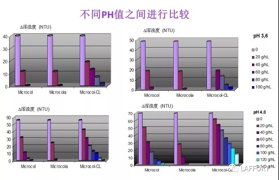 從以上四個圖表中我們可以看出,從pH=3,6開始Microcol ALPHA產(chǎn)品的吸附能力明顯要強(qiáng)于另外兩個產(chǎn)品。Microcol ALPHA產(chǎn)品可以吸附葡萄酒中含電荷數(shù)非常少的蛋白質(zhì)物質(zhì)。