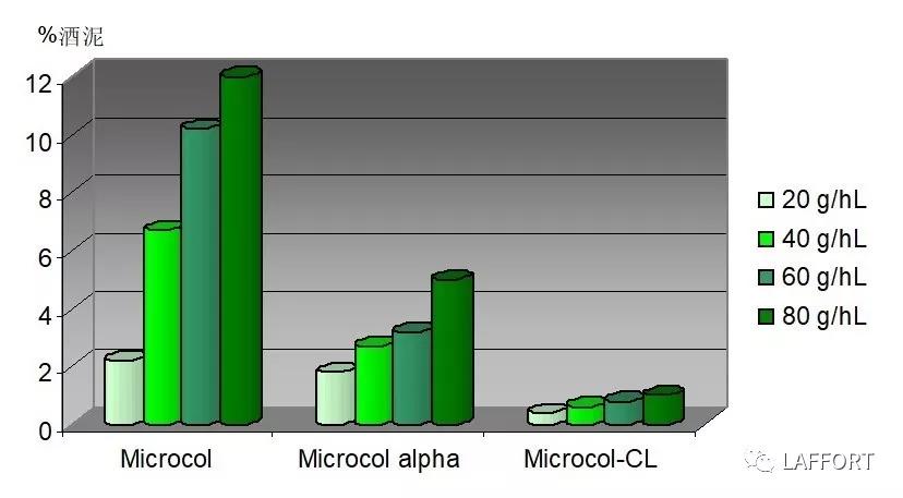 從圖表中我們可以看出, Microcol-CLG 產(chǎn)品或者M(jìn)icrocol-ALPHA 產(chǎn)品在葡萄酒澄清過程中形成的酒泥的體積百分比量要小于Microcol-p產(chǎn)品。在澄清葡萄果汁時,我們推薦使用Microcol CL產(chǎn)品來增強(qiáng)酒泥結(jié)合的緊密度,從而降低酒泥體積百分比含量 。