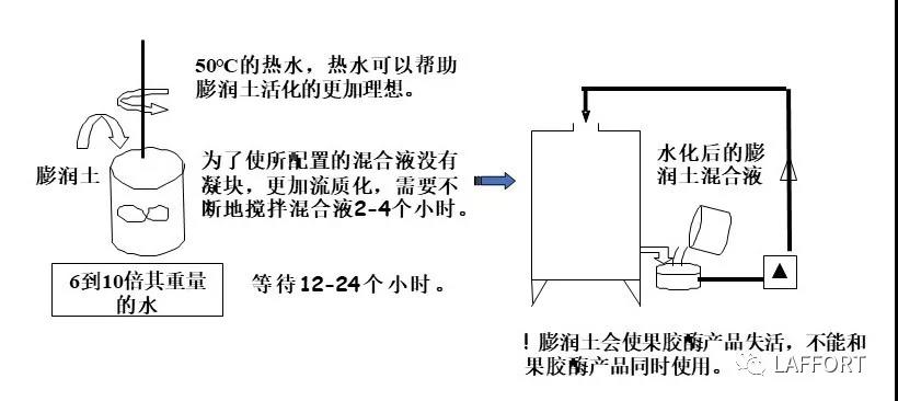 為了能夠最大程度的發(fā)揮膨潤土產(chǎn)品的作用,如何水化好膨潤土產(chǎn)品是非常關(guān)鍵的;水化的越理想,膨潤土產(chǎn)品吸附不穩(wěn)定蛋白質(zhì)的能力就越強(qiáng)。雖然在水化過程中我們會感到非??菰锓ξ?,但是這個過程是必不可少的,準(zhǔn)備工作做的越好,產(chǎn)品的使用量就越少、處理中損失的葡萄酒就越少和保護(hù)葡萄酒的芳香特征的能力就越強(qiáng)。